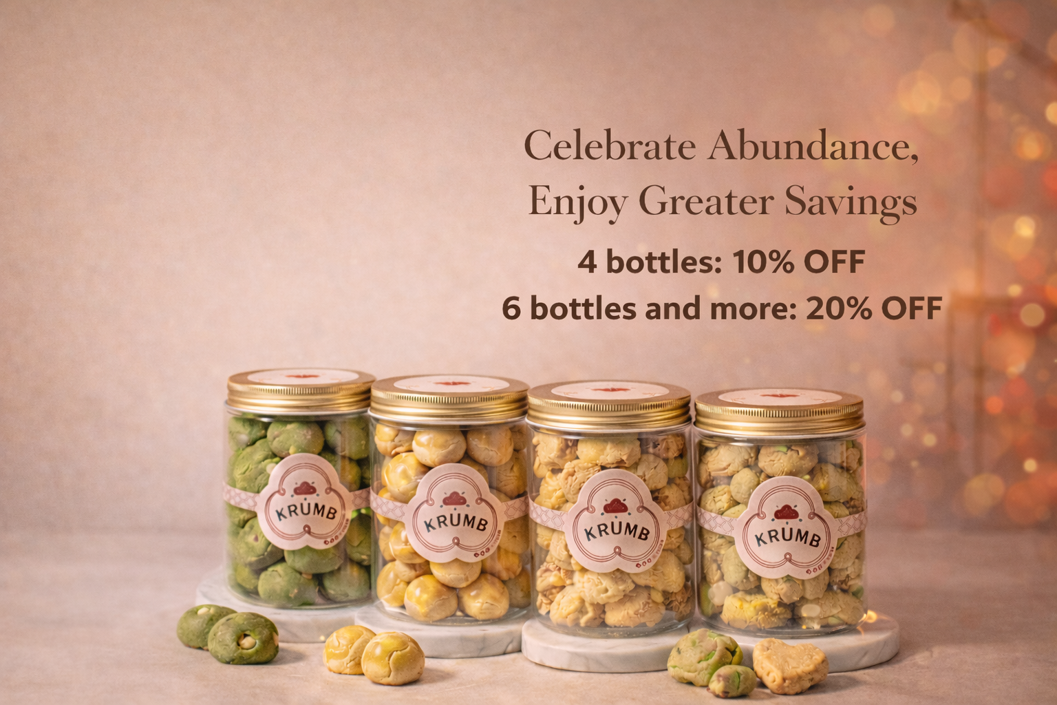 Some of the most loved CNY cookies in Singapore are timeless classics like pineapple rolls, buttery melt-in-your-mouth cookies, and nut-based favourites. At Krumb, our best-sellers include the Golden Pineapple Ball, Classic Butter Cookie, and Pistachio Cashew Cookie — crowd favourites that strike the perfect balance between tradition and modern indulgence. Thoughtfully crafted and beautifully presented, they’re ideal for both gifting and festive sharing.